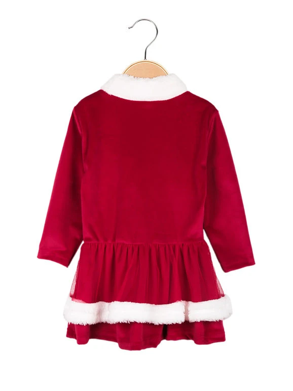 Vestito da neonata in morbida ciniglia, stampa natalizia sul davanti, inserti in ecopelliccia sul collo e sulla parte finale, tulle sulla gonna.